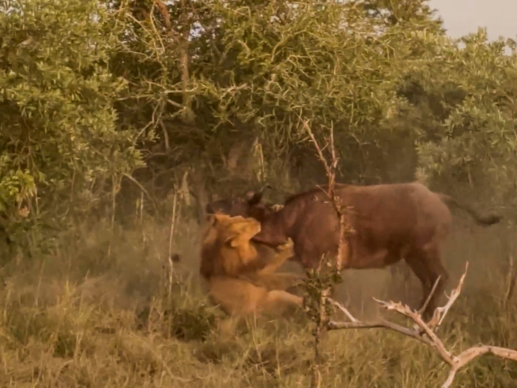 One of the buffalos, in using his horns as a weapon, lifted the male lion up and threw him off the herd member. The moment showed forth the buffalo’s incredible strength, the power of its horns and also the power of its loyalty to its friend.