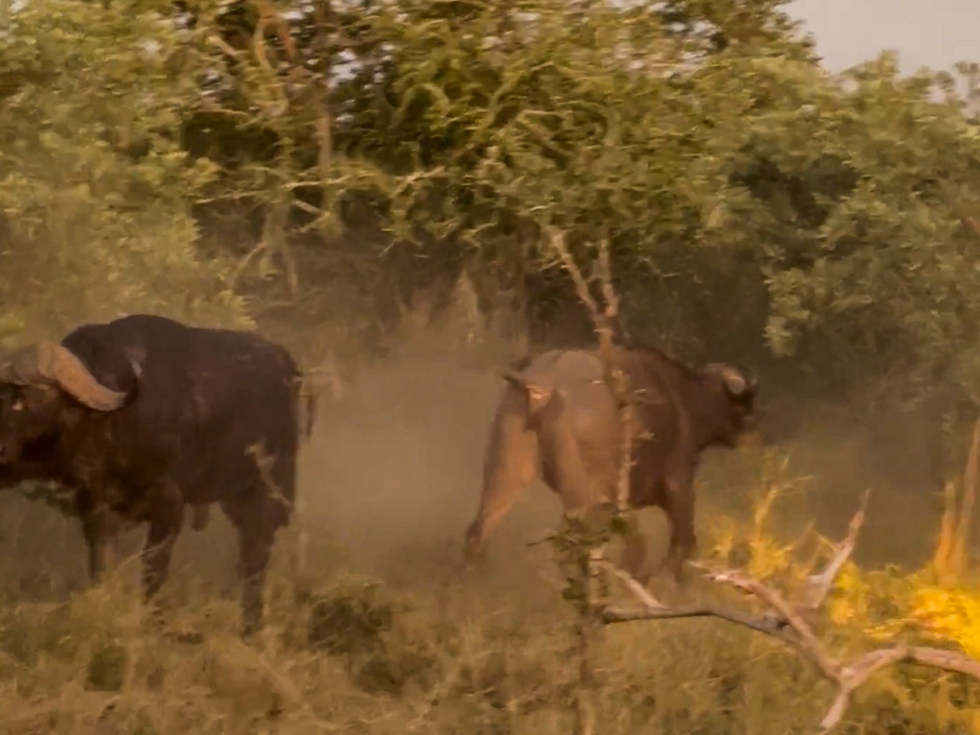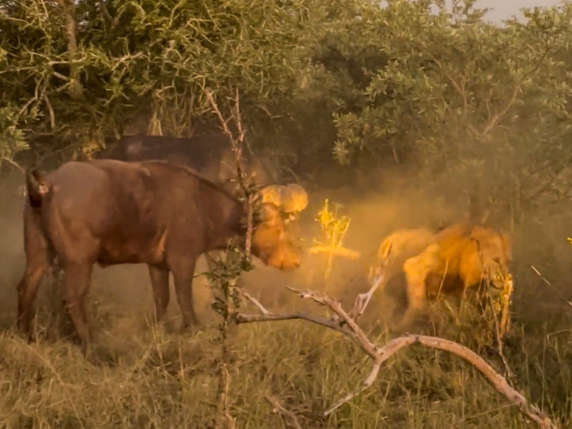 Out of the bushes, buffalo came charging towards the lions which had congregated around their intended prey.