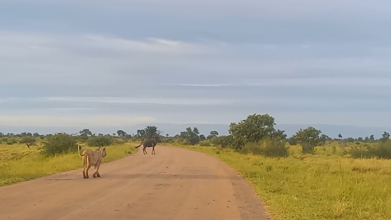 The wildebeest had been crossing the road ahead when their paths almost met. Fortunately for the wildebeest, it spotted her in the distance before she had a chance to attack.