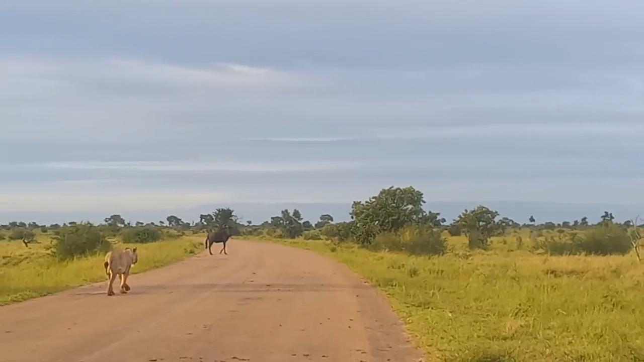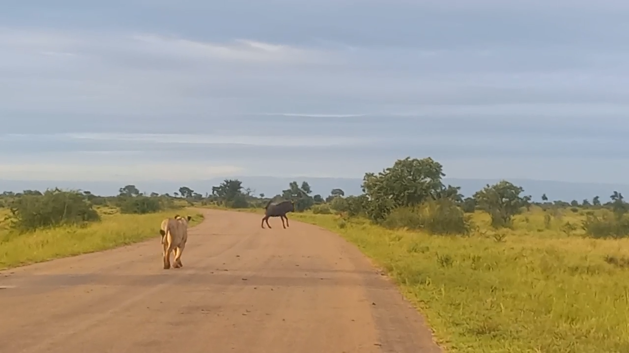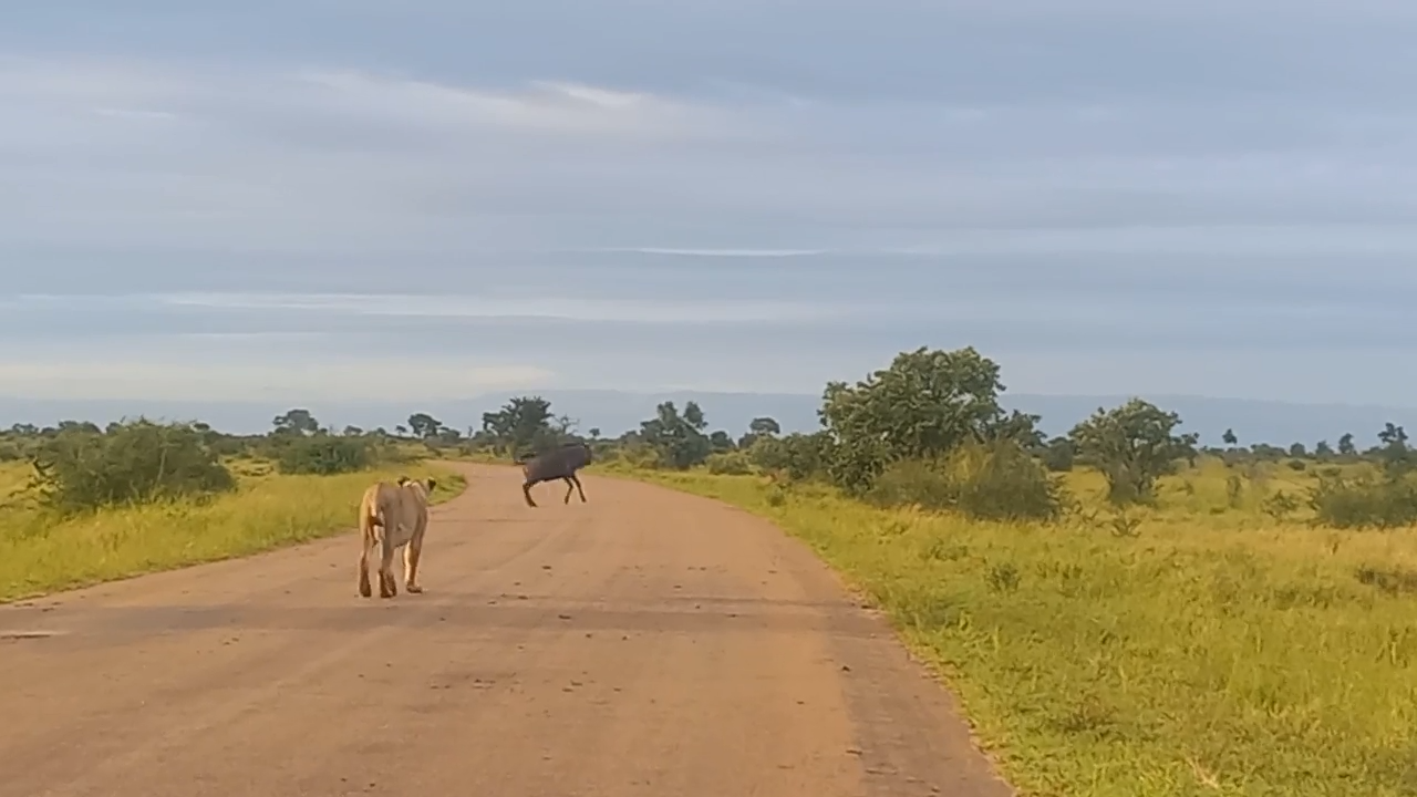 The quick reaction of a wildebeest saved it from the threat of a lioness, as she made her way through the bushveld.