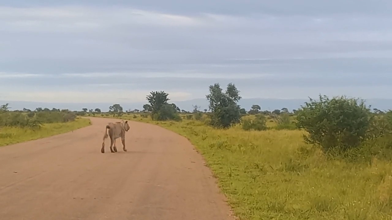 Excellent continued to film the lioness as she walked on ahead. The road was long but she appeared to have all of the time in the world.